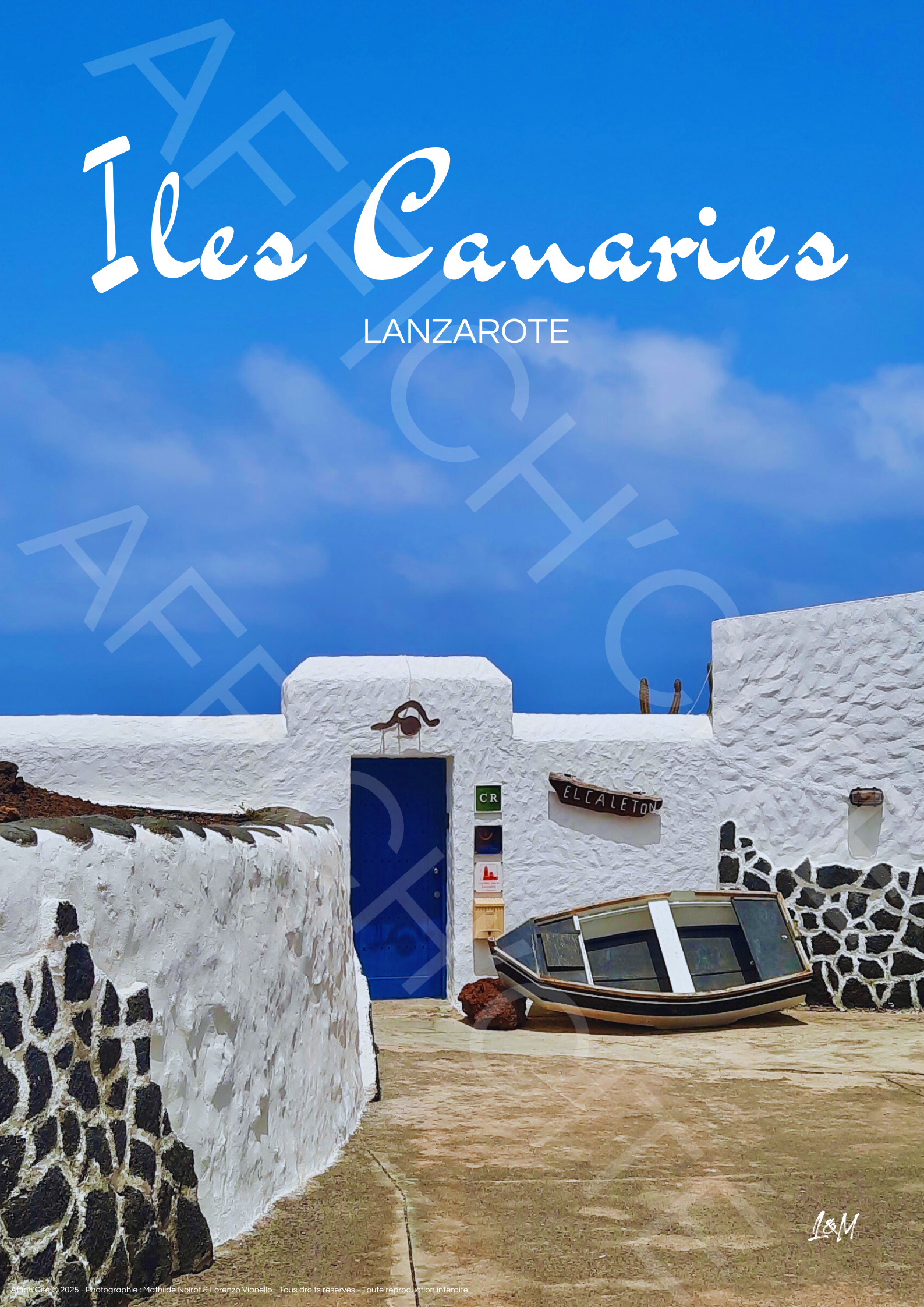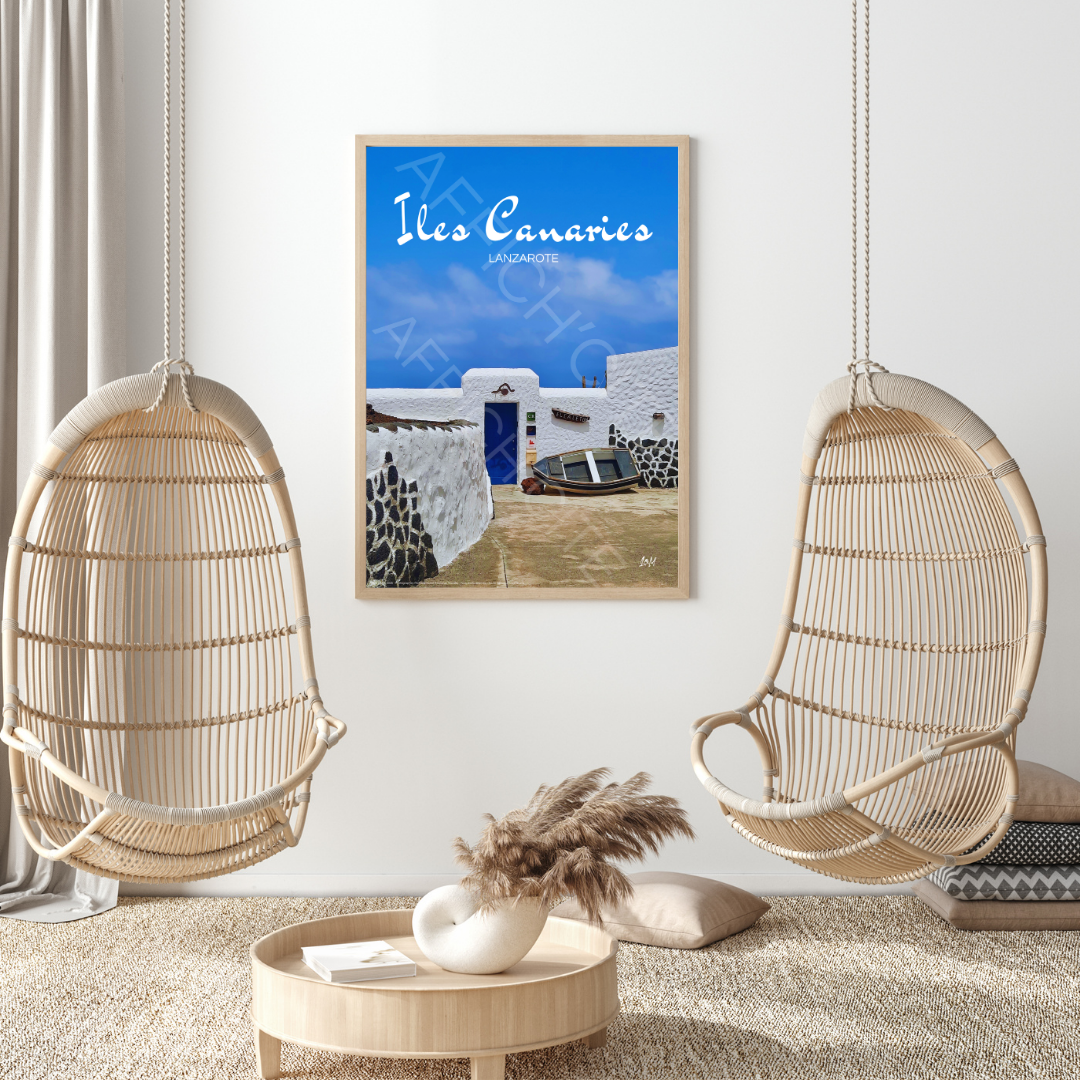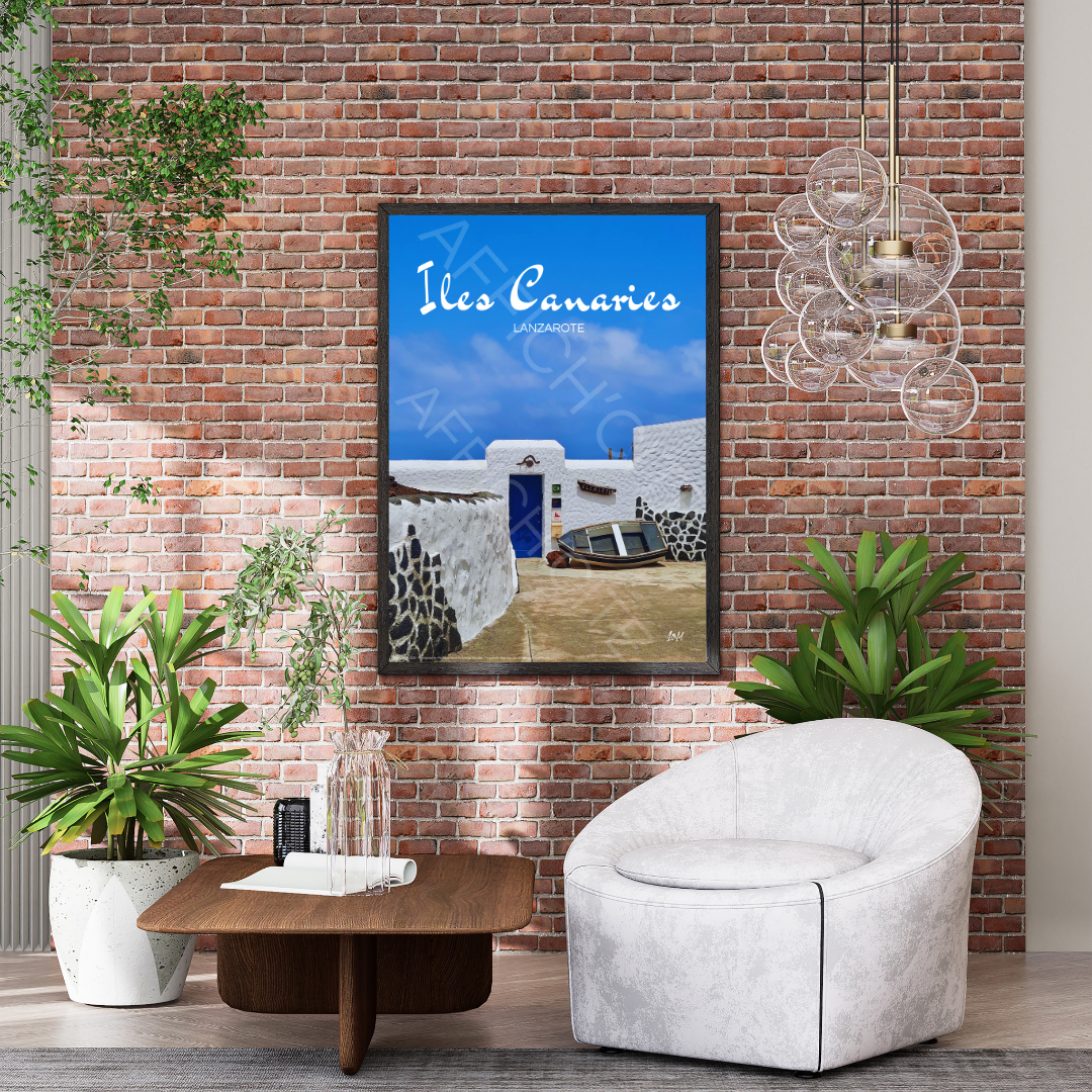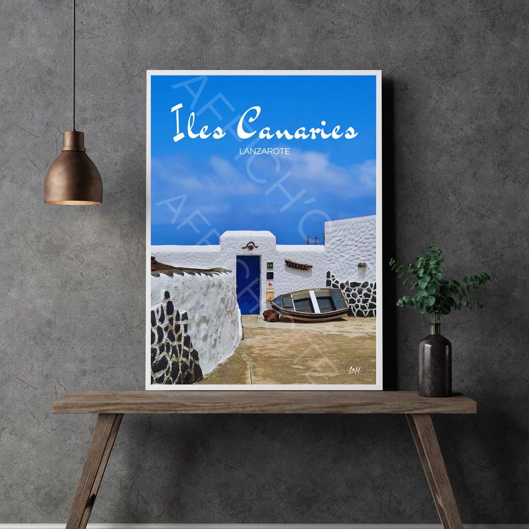 Une scène apaisante de Lanzarote, où un mur blanc immaculé met en valeur la simplicité d'une barque solitaire. Un décor minimaliste et élégant qui invite au voyage et à la rêverie.
