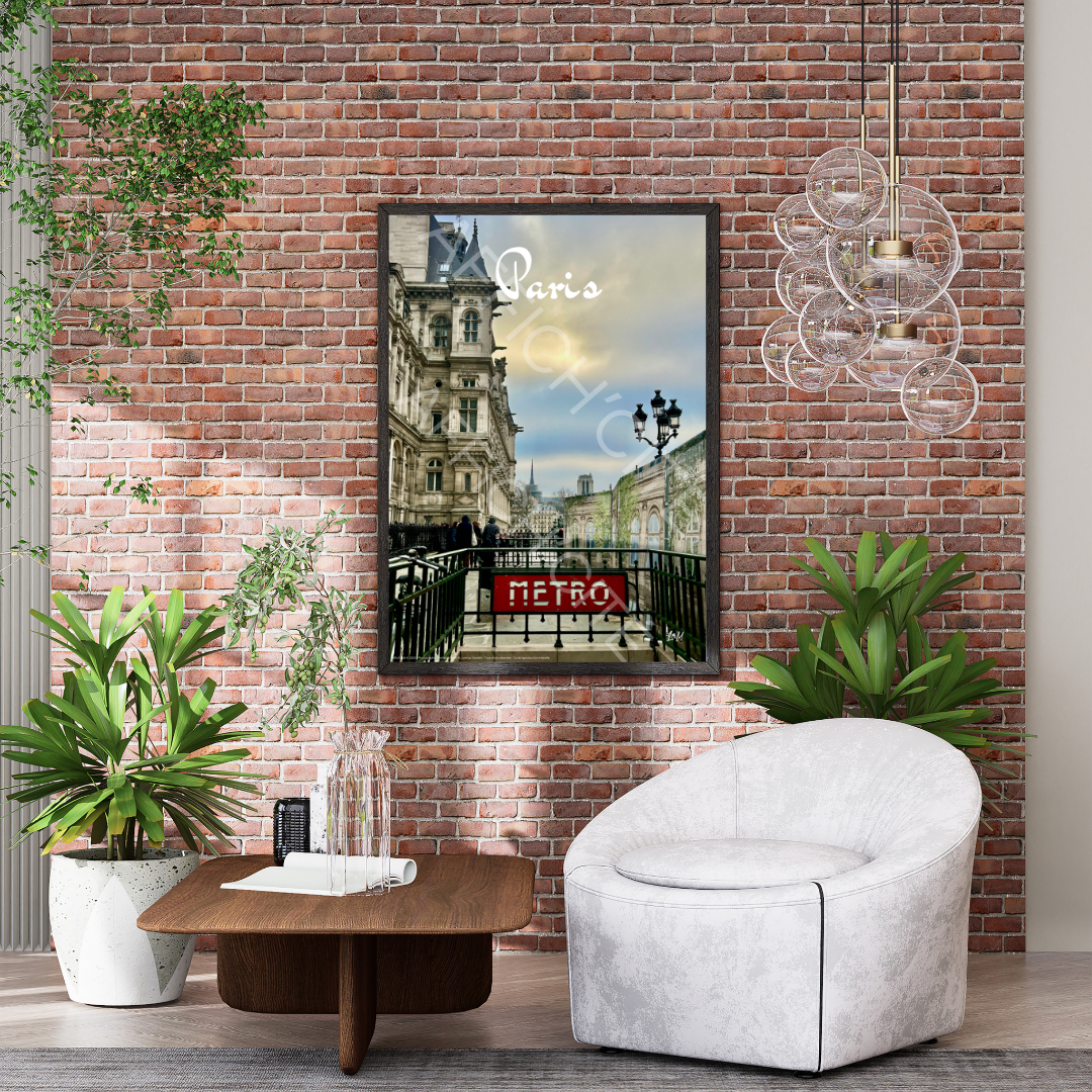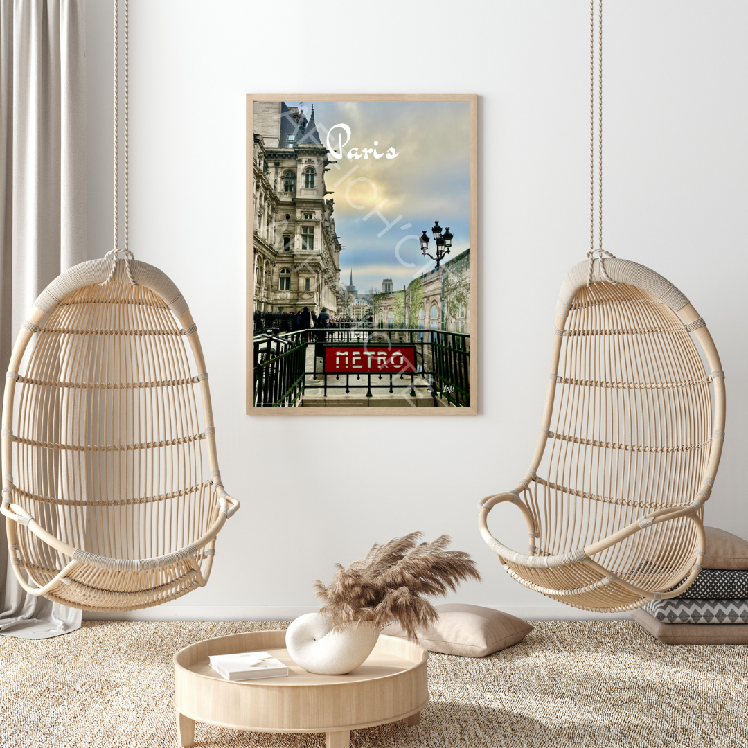 Plongez au cœur de l’élégance parisienne, capturant l’entrée mythique du métro face à l’Hôtel de Ville, sous un ciel pastel et la silhouette de Notre-Dame en fond. Une touche vintage et romantique, parfait pour les amoureux de Paris.